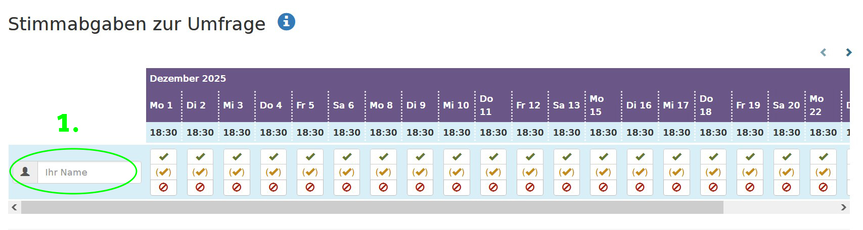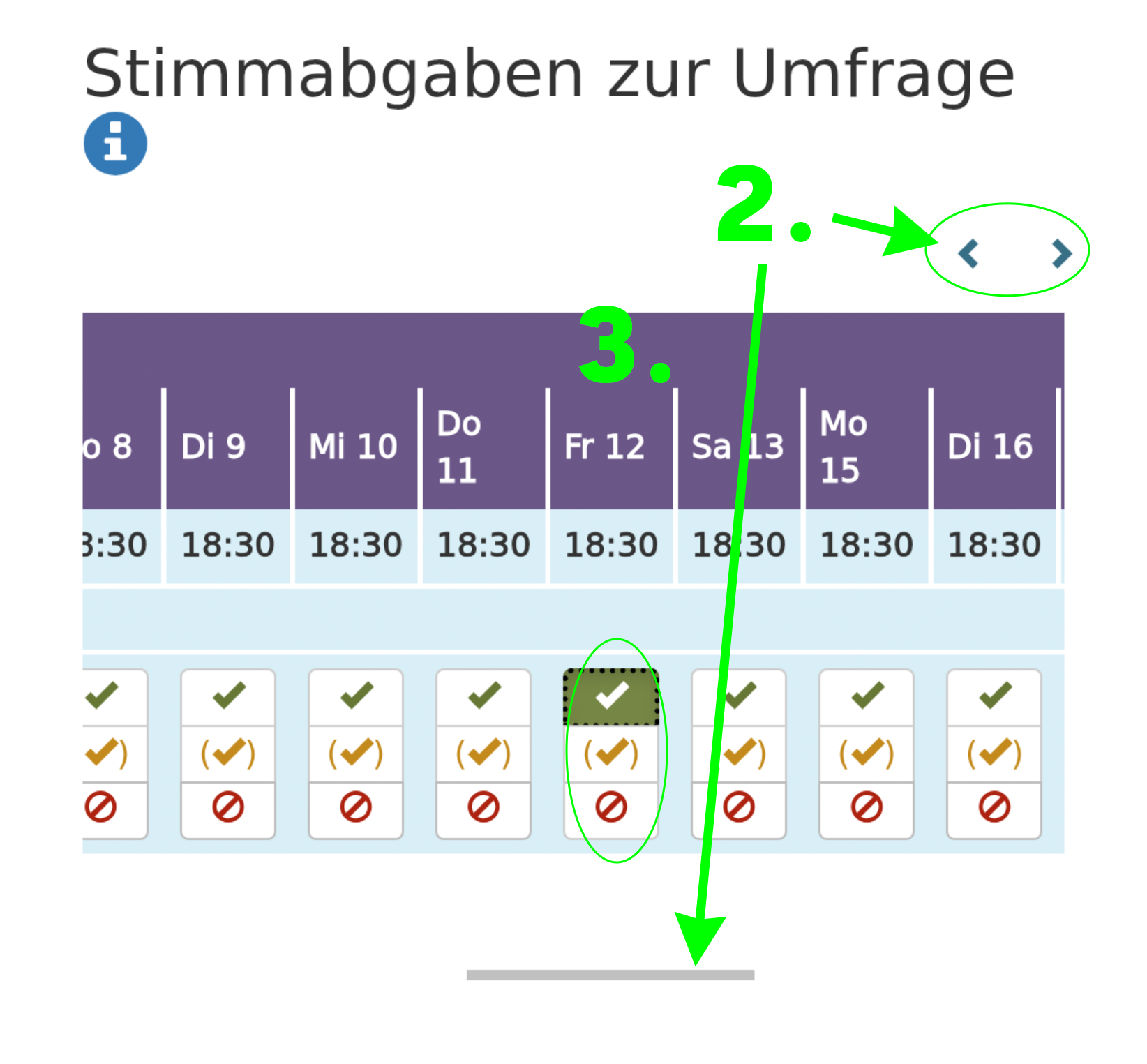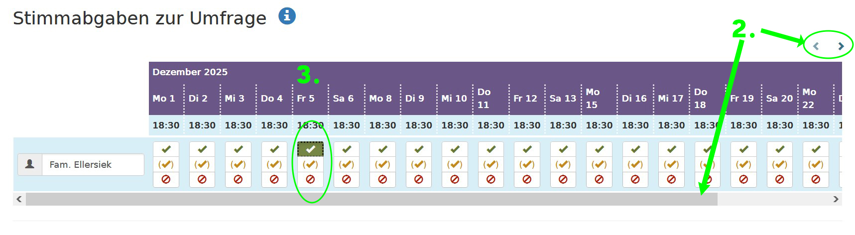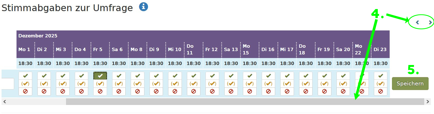 Da einige Termine zur Verfügung stehen, kann man mit dem Scrollbalken oder mit Klick auf den "Pfeilen" einen Datumsbereich auswählen - Datum auswählen: Auf das grüne Käkchen klicken