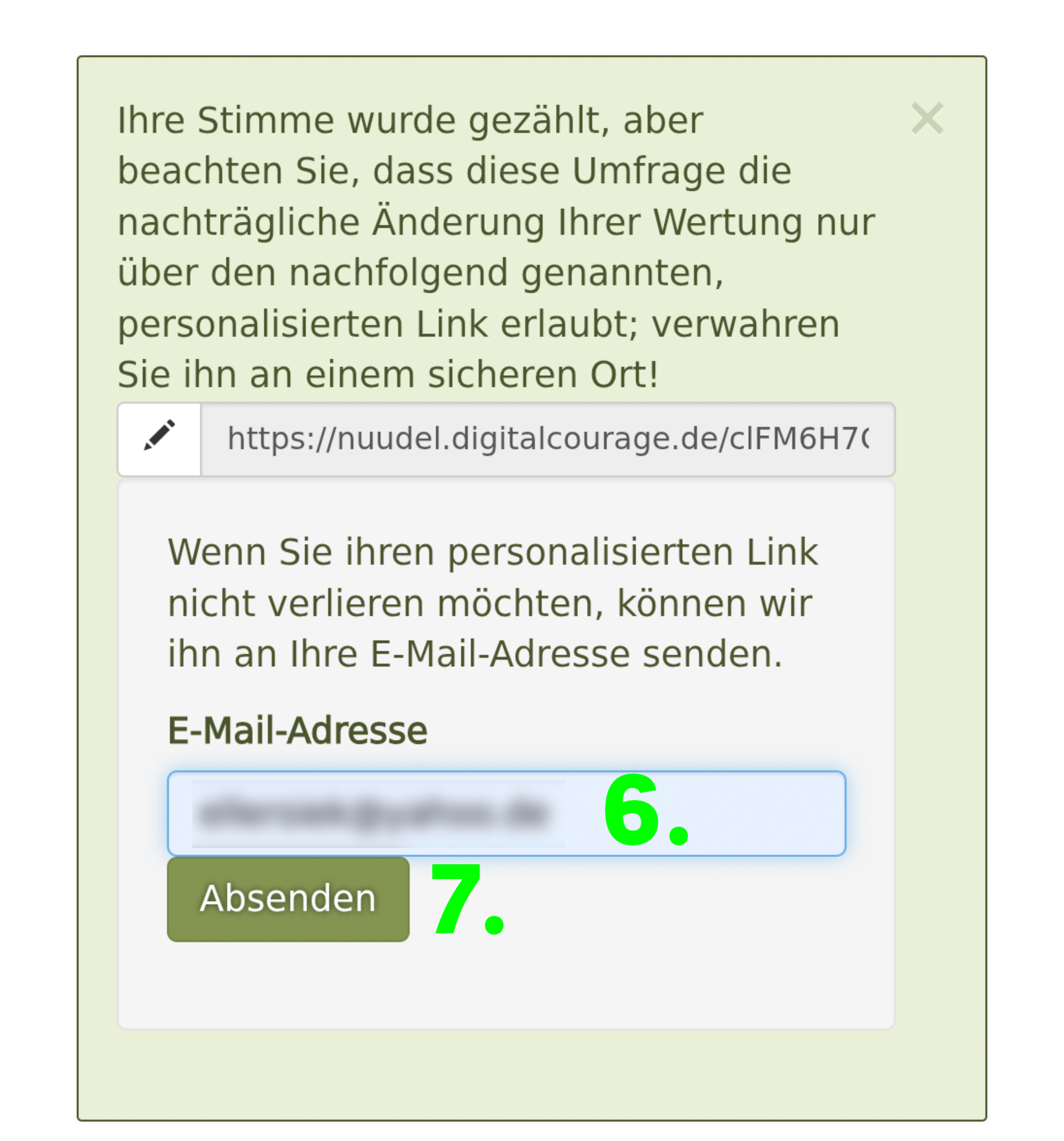 - Kein muss, aber könnte hilfreich sein: Email-Adresse eintragen. Man bekommt einen Link zugesendet, mit dem man seinen eigenen Eintrag noch ändern. Nuudle speichert keine Emailadressen. Deshalb ist für die Änderungen der Link notwendig.