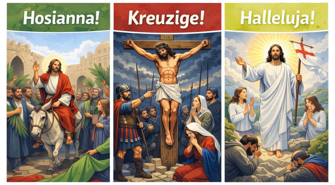 In Jesu letzten Lebenstagen überschlagen sich die Ereignisse. Das umstehende Volk schreit mal begeistert „Hosianna!“, mal wütend „Kreuzige!“, um am Ende in ein großes „Halleluja!“ einzustimmen. Inmitten dieses Geschehens, in dem noch einmal die ganze Bandbreite menschlichen Erlebens und Erleidens aufblitzt, ereignet sich das, was für uns Christen Zentrum unseres Glaubens ist. Mit seinem Weg ans Kreuz und mit seiner anschließenden Auferstehung von den Toten überwindet Jesus alle lebensfeindlichen Kräfte und Mächte. Das Leben siegt, weil Gott sich ihm mit all seiner Liebe zuwendet.