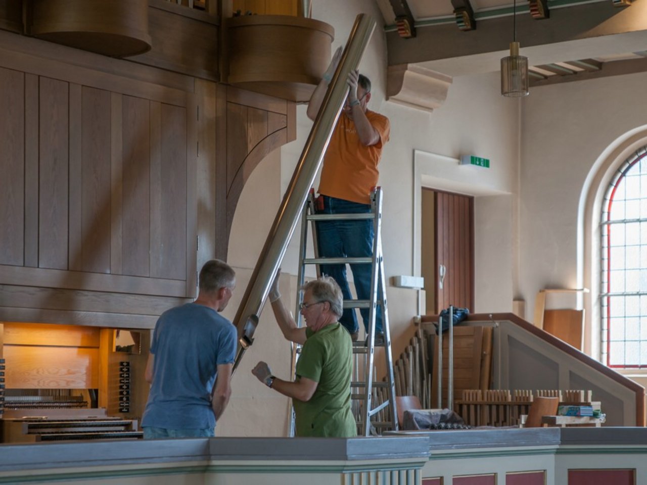 Nun ist es dank vieler Einzelspenden aus der Gemeinde und der Hilfe der Finanzgemeinschaft des Kirchenkreises möglich geworden, dass die dringend erforderliche Renovierung und die weitere Komplettierung der Orgel angepackt werden konnte. Die Fa. Johannmeier hat dazu den Auftrag bekommen und – wie auch beim Hausbau üblich – wurde vereinbart, einiges in Eigenhilfe zu tun. Da ist so einiges angefallen. Handreichungen, der Transport der Orgelpfeifen innerhalb der Kirche oder auch das Auswaschen der Metallpfeifen. Einige Männer aus der Gemeinde haben sich bereit erklärt, hier mitzuhelfen und damit die Kosten zu senken. Immerhin mussten 1.172 Orgelpfeifen transportiert, gelagert und gereinigt werden. Auf diesem Wege einen herzlichen Dank an die Helfer.